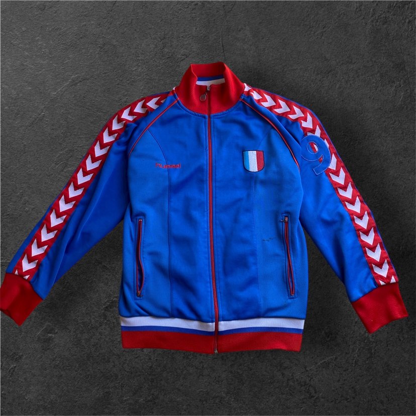 Mavi renkte, kırmızı ve beyaz 9 numara detaylı, fermuarlı Fransız yapımı Grenoble tracksuit.Bisiklet yaka ve yumuşak dokulu kumaştan yapılmıştır.Defo olarak Küçük kalem izleri vardır.Ölçüleri uzunluk:65 fermuar kapalıyken genişlik:50