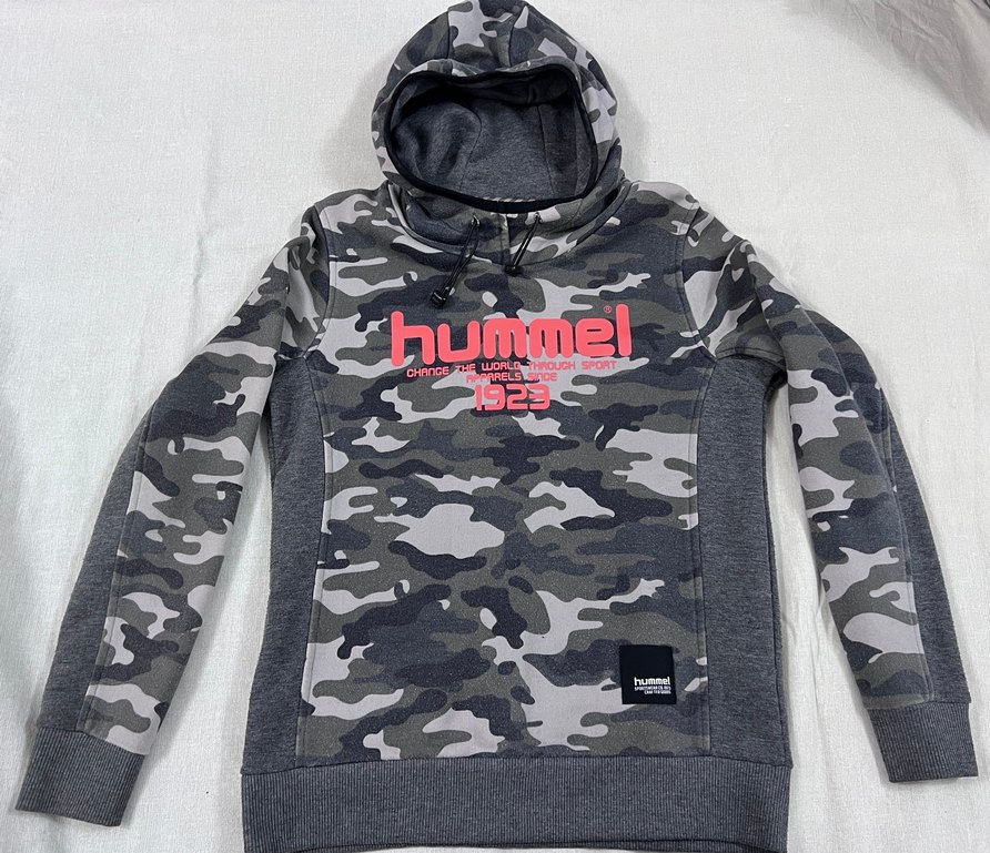 Hummel gri kamuflaj desenli sweatshirt. Ürün boyutları fotoğraflarda mevcuttur.