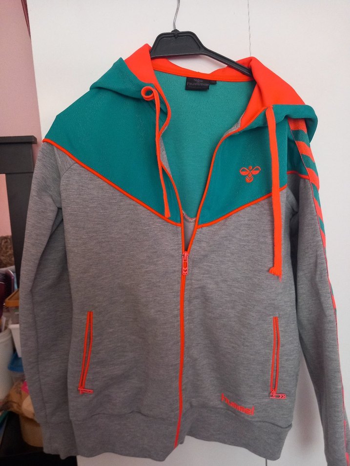 Hummel marka, fermuarlı, uzun kollu, kapüşonlu kadın ceket. Yumuşak kumaş, bol kesim, gri renk üzerine turkuaz ve turuncu detaylar içerir. Günlük rahat stil için uygundur. iade kabul etmiyorum üst çok fazla kullanılmadı altta sadece hafif renk değişimi var Kullanıma bağlı