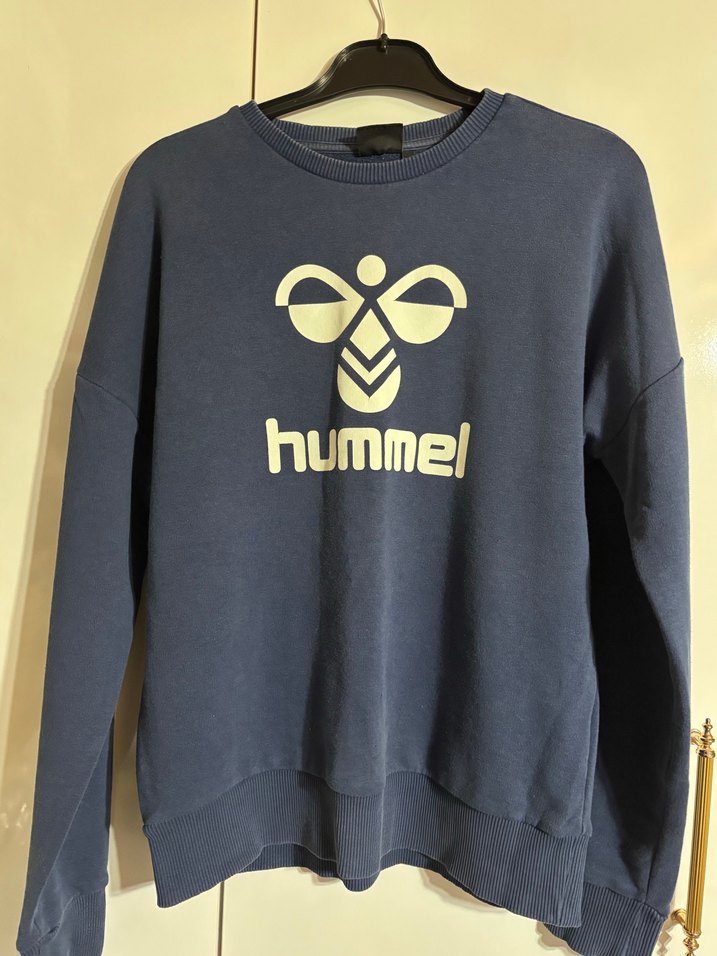 Hummel markalı, örgü dokulu, baskılı ve koyu mavi renkte, yuvarlak yaka, uzun kollu, bol kesim sweatshirt. Asıl rengi 2. Fotoğraftaki gibidir
