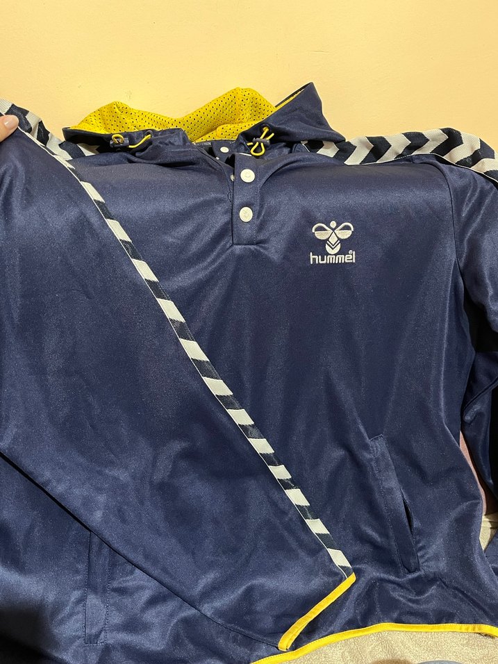 Hummel markalı, kapüşonlu ve fermuarlı mavi spor mont. Uzun kollu, parlak sentetik kumaştan, baskılı detaylı ve dar kesim. iki kol arası 61 santim uzunluğu 72 santimdir