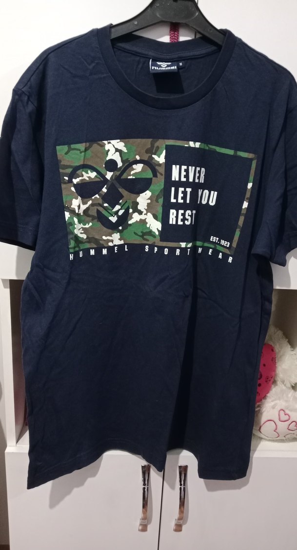 Hummel marka, kısa kollu, yuvarlak yaka, bol kesim erkek tişört. Kamuflaj baskılı ve motivasyonel yazılı, koyu mavi renkte.
