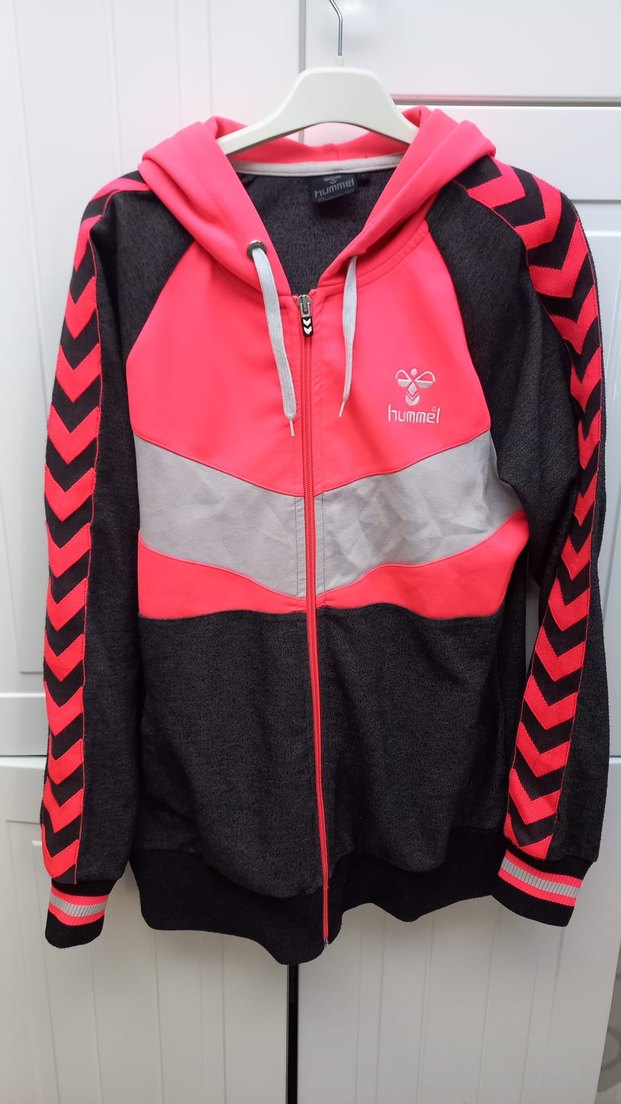 Hummel markalı, fermuarlı ve kapüşonlu, uzun kollu pembe ve gri baskılı, yumuşak ve sıcak dokulu kadın ceketi. Spor tarzı için uygun.