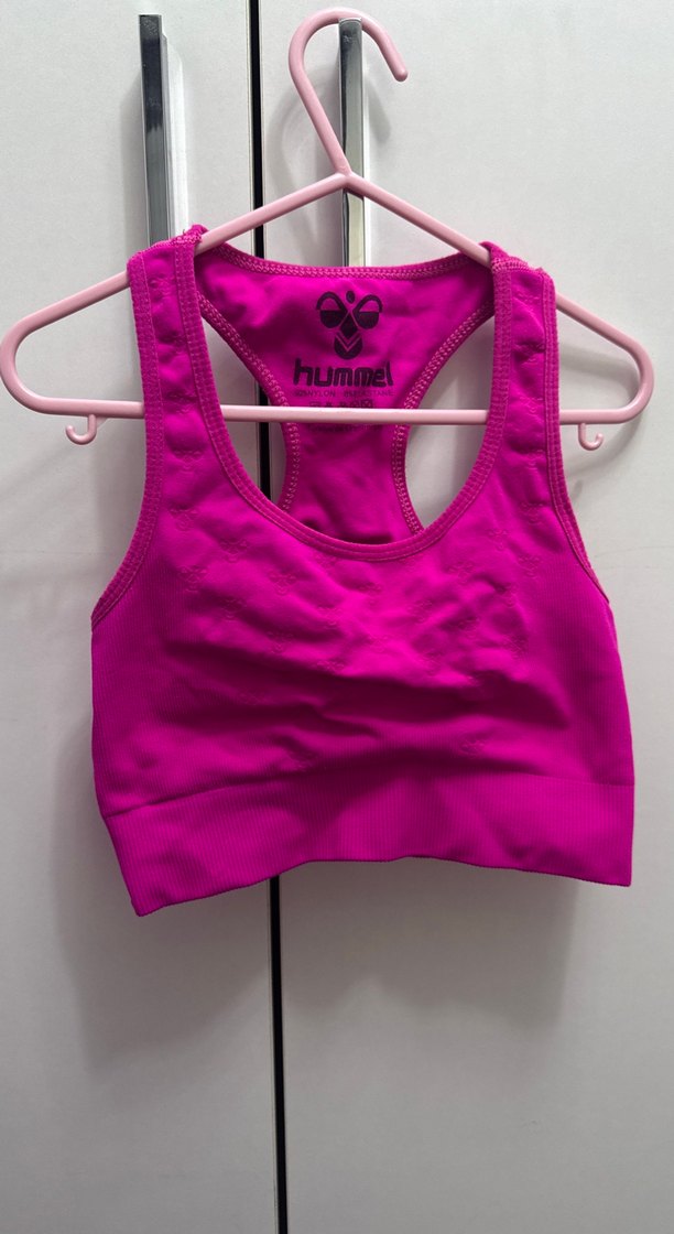 Hummel marka koyu pembe sporcu sütyeni, baskılı logo ve racerback tasarıma sahip, streetwear ve athleisure tarzına uygun.