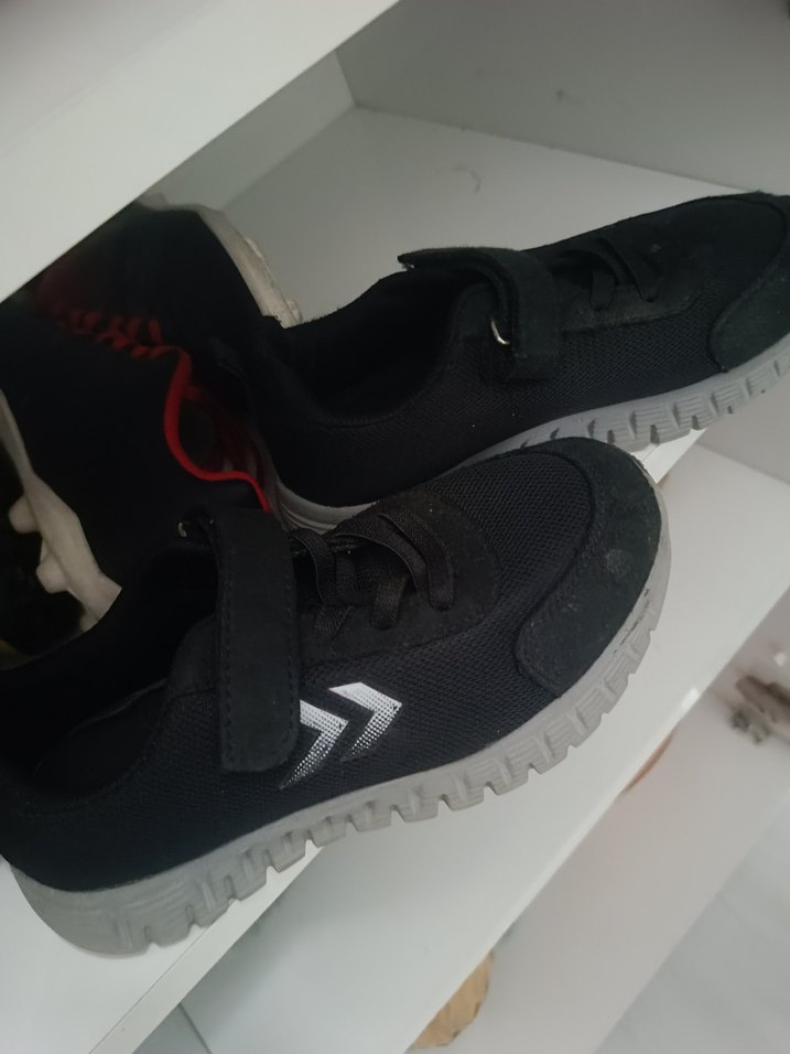 Siyah renkli, baskılı detaylara sahip erkek çocuk spor ayakkabısı. Kolay kullanım için Velcro bantlı, rahat kauçuk tabanlı, sokak tarzı tasarım.