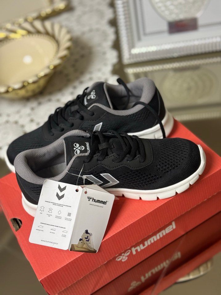 Hummel markalı, siyah ve gri renkli, baskılı desenli erkek spor ayakkabısı. Kaydırmaz kauçuk taban ve cırt cırtlı kapama ile rahat kullanım sağlar.