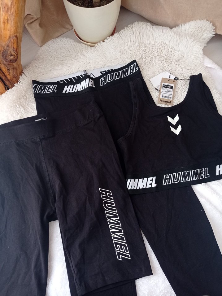 Pamuk kumaştan, uzun kollu crop top ve mini şortlardan oluşan siyah, vücuda oturan kadın spor takımı. Baskılı Hummel logosu sportif bir hava katıyor. detaylı bilgi için @SevdaSimsekCiftci hesabından ulaşabilir siniz