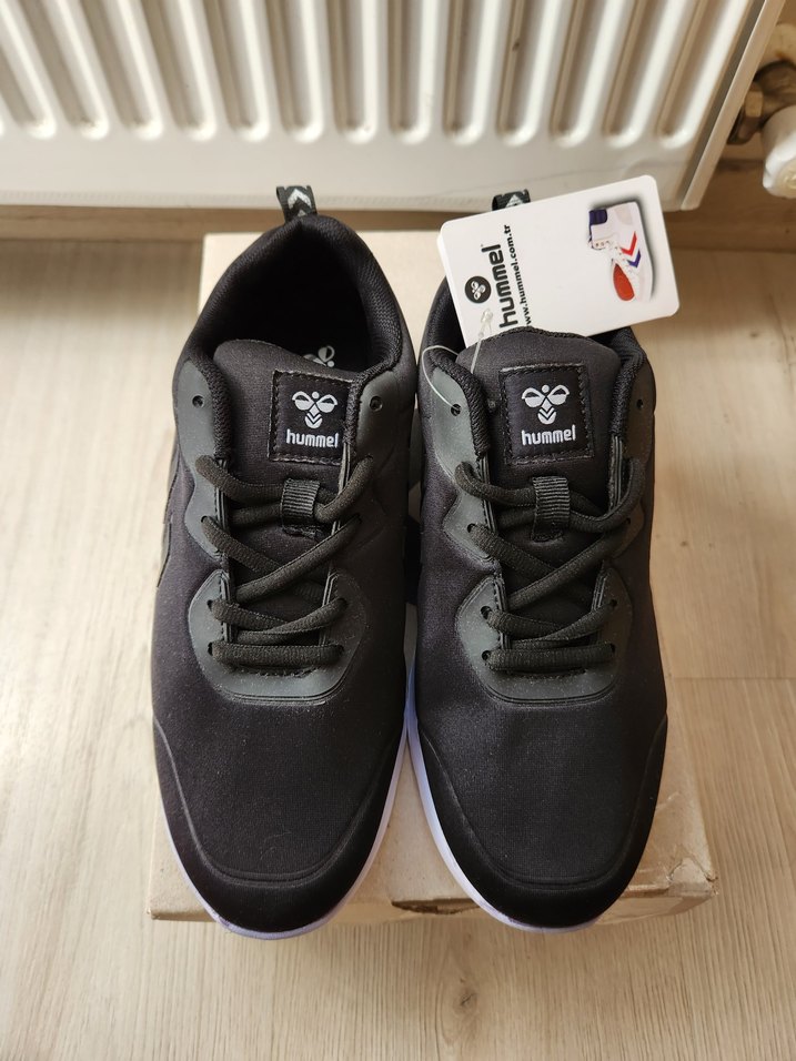 Hummel markalı siyah kadin spor ayakkabılar 37 numara, velcro bantlı ve baskılı desene sahip. spor ve streetwear tarzını birleştiriyor.