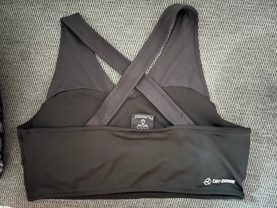 Siyah biker stilinde spor sütyeni, çapraz askılar ve pürüzsüz dokusuyla rahatlık ve destek sağlar. Normal uzunluktadır ve 'A' harfi detayı bulunur.