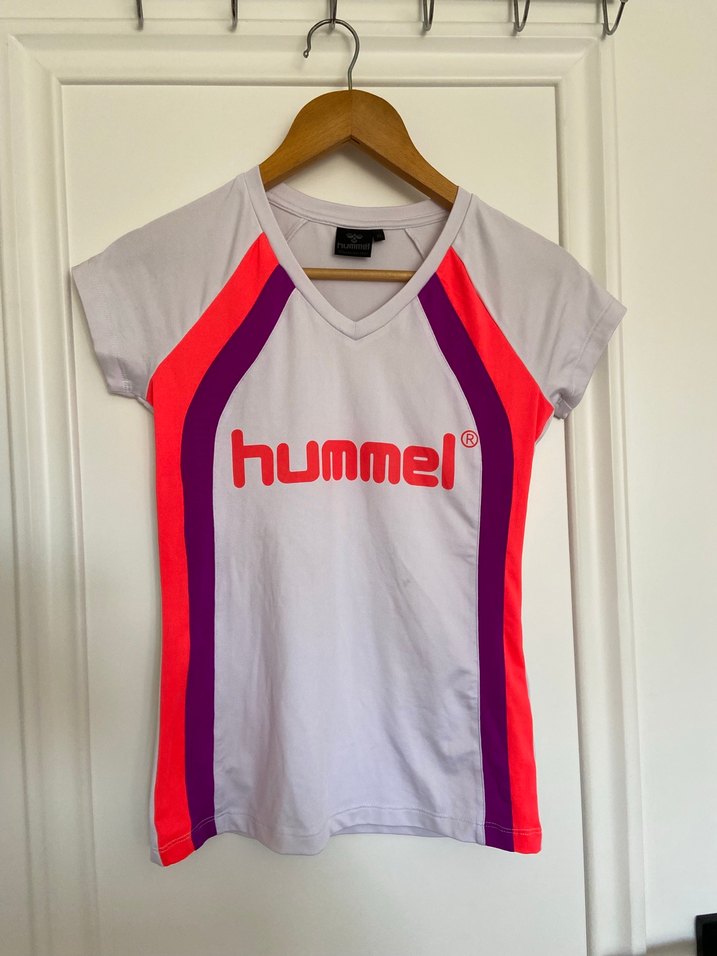 Kısa kollu, V yaka beyaz tişört, kırmızı ve mor şeritlerle detaylandırılmış, Hummel logosu bulunur. Spor şıklık için uygundur. ♀️