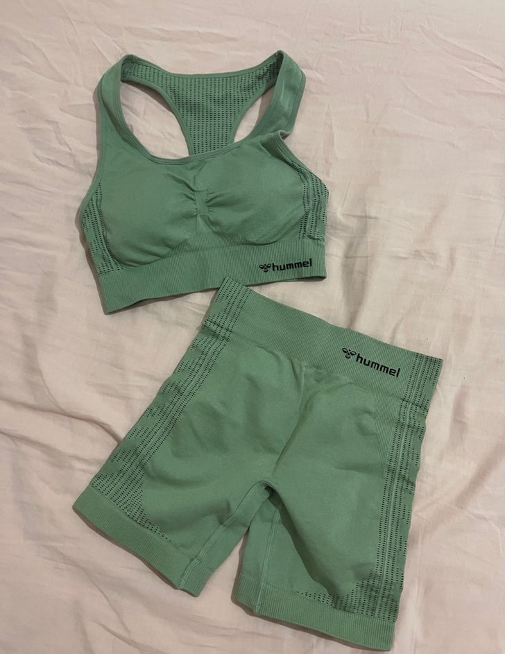 Hummel markalı, yeşil mini spor takımı, kolsuz ve straplez üst ile kısa paça alt, yumuşak sentetik kumaştan