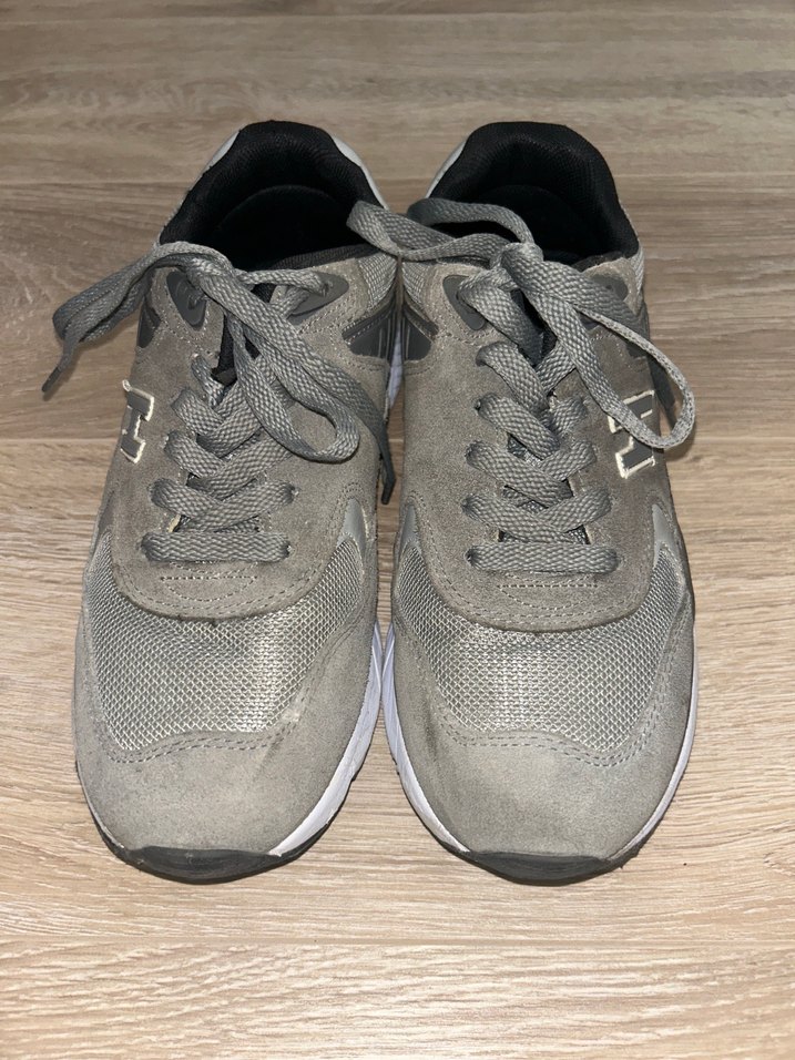 Gri renkli, bağcıklı ve ince topuklu kadın spor ayakkabısı. Kauçuk malzemeden üretilmiş, spor ve günlük kullanıma uygun sade tasarım. 39 numara