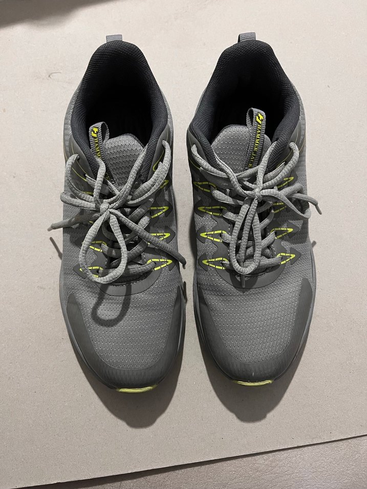 Gri renkli, ve bağcıklı spor ayakkabı, kauçuk tabanlı, sokak stili ve spor için uygun.