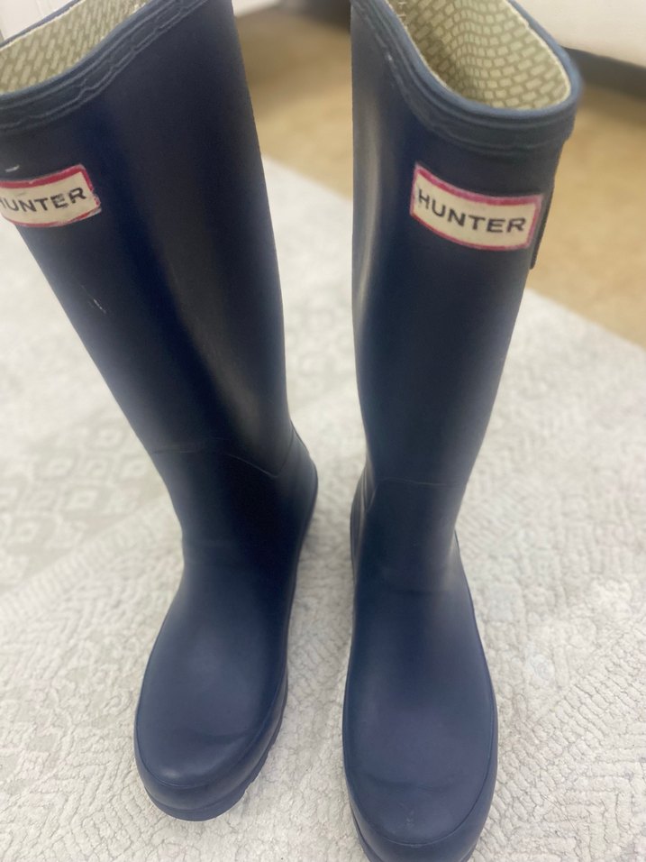Lacivert renkte, lastik malzemeden yapılmış, diz boyu Hunter markasına ait rahat üst yan tokası eksik