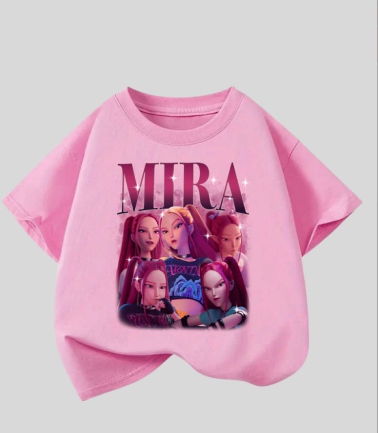 Pembe renkli, baskılı desenli kız çocuk tişörtü. Kısa kollu, yuvarlak yaka ve bol kesim. Yumuşak sentetik kumaştan üretilmiştir.