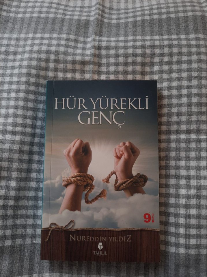Nureddin Yıldız'ın "Hür Yürekli Genç" romanı, özgürlük ve cesareti simgeleyen iplerden kurtulan ellerle kaplanmıştır. 9. baskı.