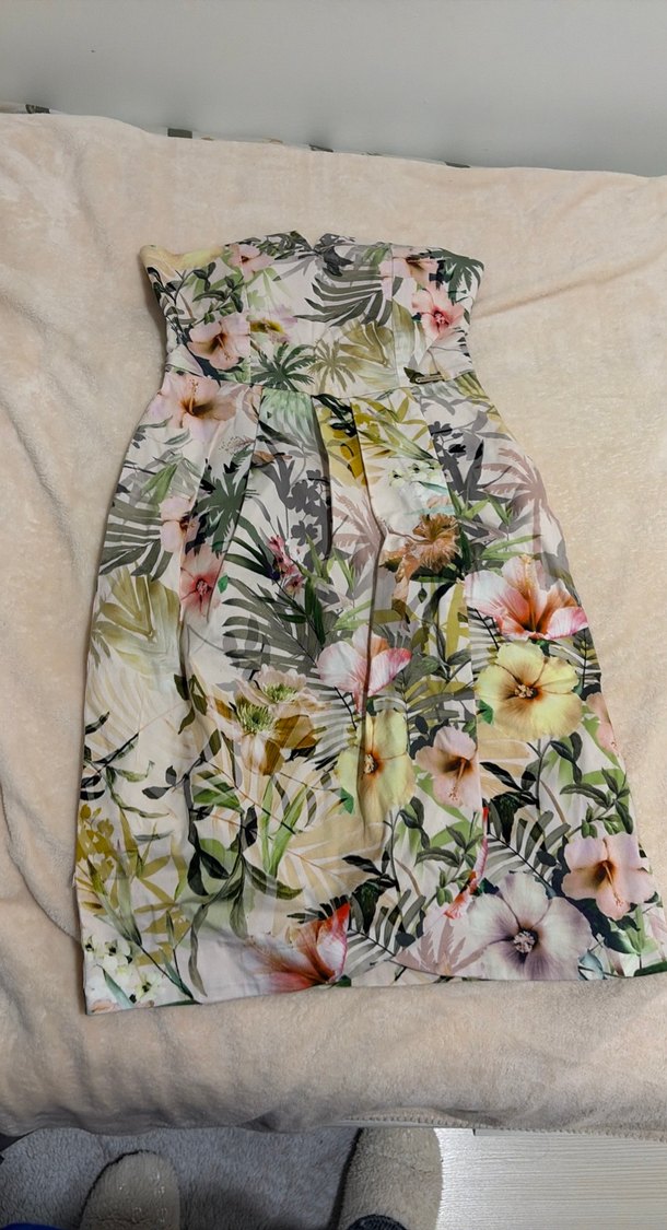 Straplez, pileli tasarıma sahip, pastel tonlarda çiçek desenli ve vücuda oturan elbise Kolsuz ve yumuşak sentetik kumaştan, bohem dış mekan tarzına uygundur.
