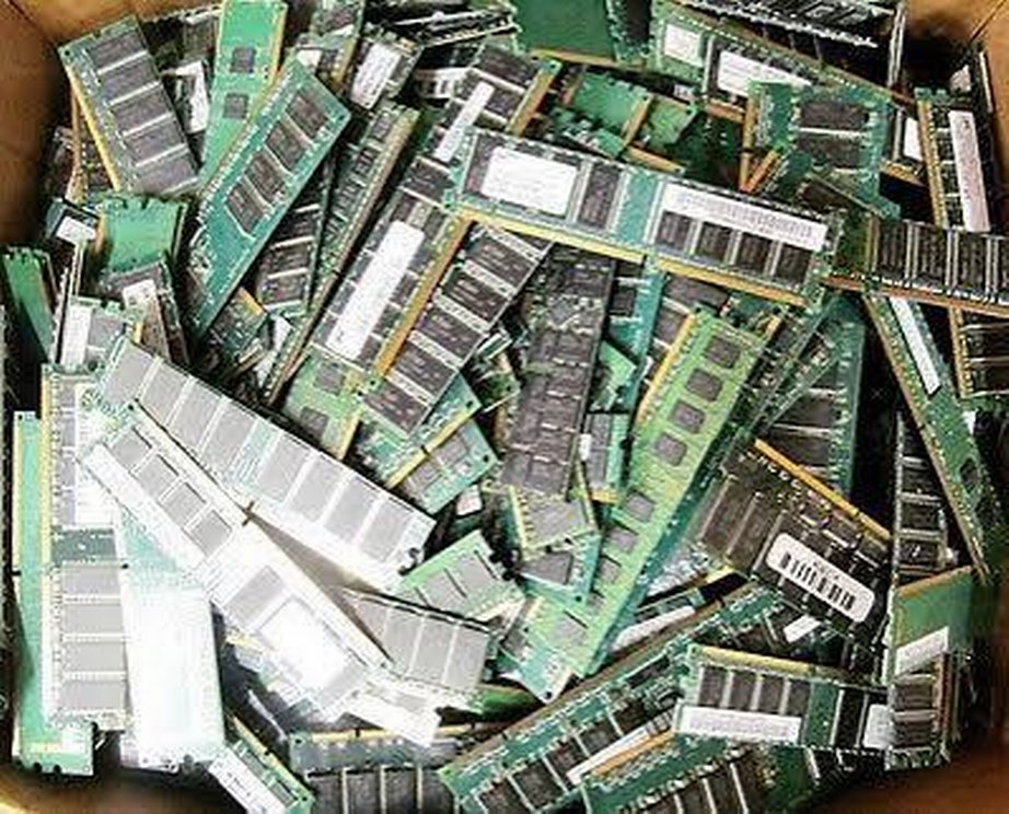 Çeşitli bilgisayar cihazlarında kullanılan yeşil parlak bilgisayar bellek modülleri.