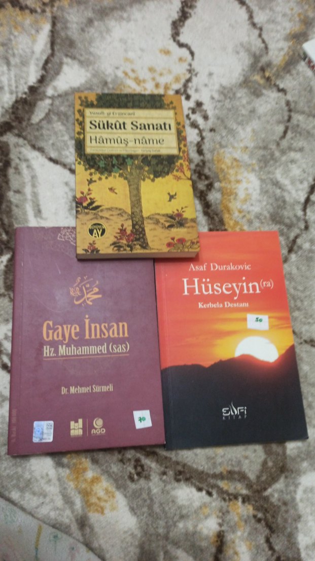 Asaf Durakovic'in 'Hüseyin (ra) Kerbela Destanı', Dr. Mehmet Sürmeli'nin 'Gaye İnsan Hz. Muhammed (sas)' ve 'Sükût Sanatı Hâmuş-nâme' kitapları seti.