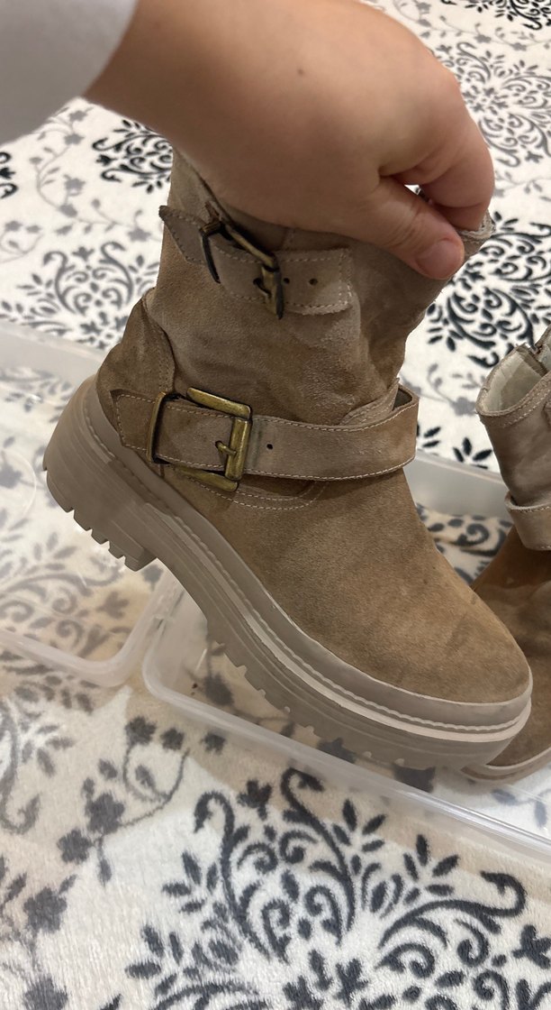 TAş bej renk arası süet kadın botları, kalın topuklu ve tokalı detaylıdır. Rahat ve günlük kullanım için uygundur Saraç shoes dan alınmıştır iç dış gerçek deri