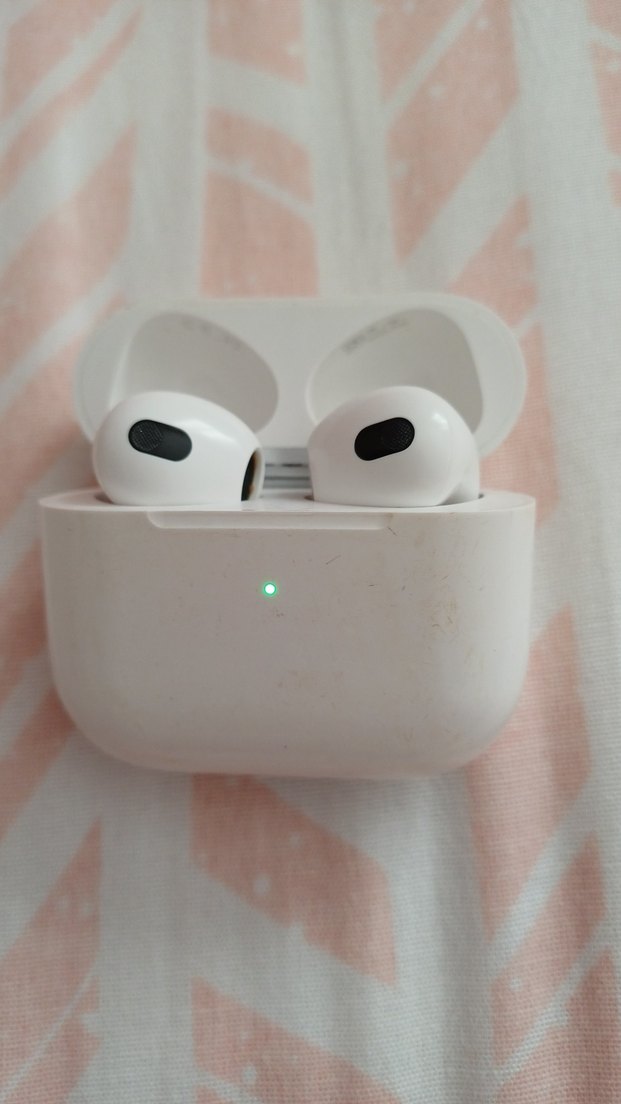 Ön kısmında küçük bir gösterge ışığı bulunan beyaz kablosuz kulaklık şarj kutusu. Kompakt ve taşınabilir tasarım. sağ kulaklık çalışır durumda sol kulaklıktan ses gelmiyor.tamirciye götürmedim yaptırılabilir