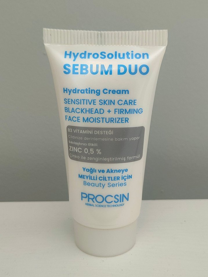 HydroSolution Sebum Duo, hassas ciltler için nemlendirici kremdir. Siyah nokta azaltır, cildi sıkılaştırır, %0.5 çinko ve B3 vitamini içerir. Yağlı ve akneye meyilli ciltlere uygundur. Hiç kullanılmadı.