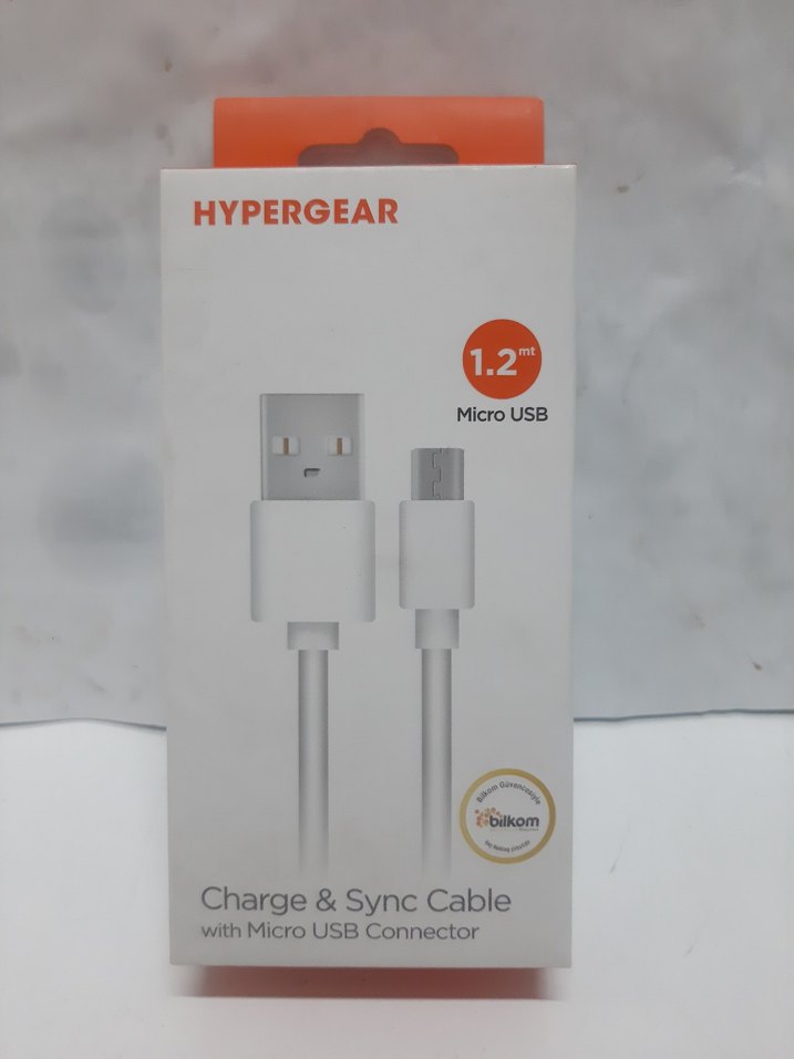 HYPERGEAR markalı 1.2 metre uzunluğunda beyaz ve gri renkli Micro USB bağlantılı şarj ve senkronizasyon kablosu. Micro USB uyumlu cihazlarla kullanılabilir.