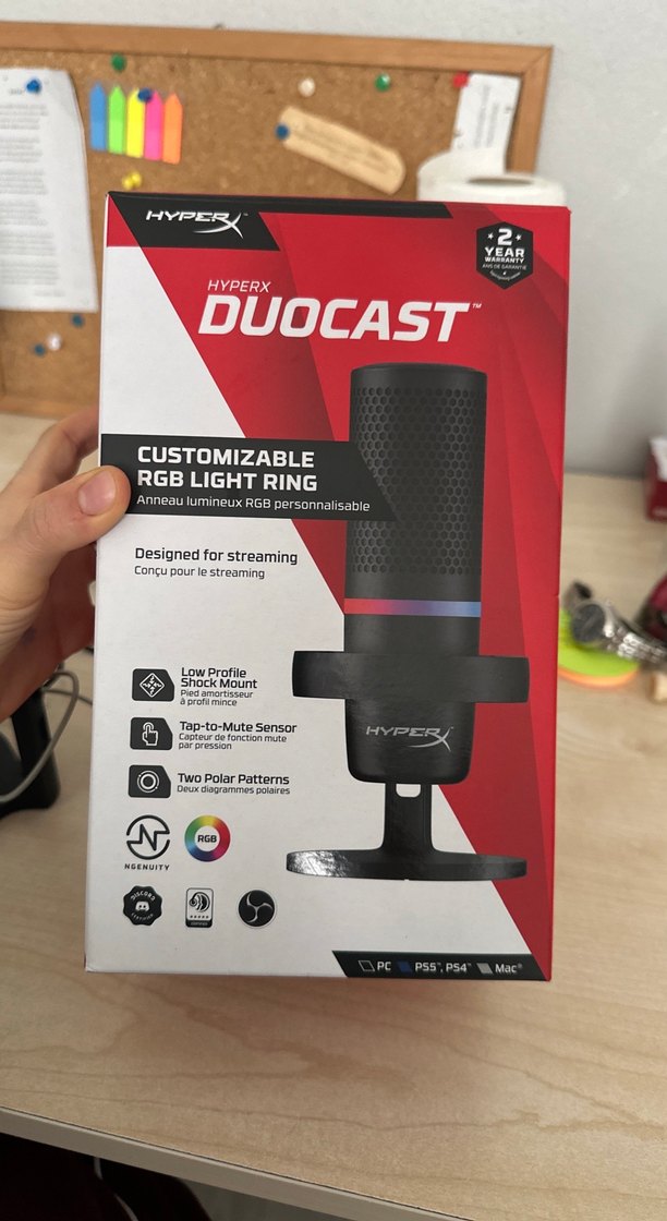 HyperX DuoCast, yayın için tasarlanmış kırmızı mikrofon. Özelleştirilebilir RGB ışık halkası, düşük profilli şok montajı, dokunmatik susturma sensörü ve iki polar deseni bulunur. Bu ürün bilgisayara girecek şekilde görselde göründüğü gibi usb çıkışlı ama ben ekstra bağlantı aldım ve usb ucunu type c uca çevirdim. Çıkıp takılabilir. Böylelikle ses kaydı yapmak istenirse veya yayınları tabletten telefondan açmak istenirse type c uca uygun bir şekilde bağlantı yapılabiliyor. Yanında göndereceğim.