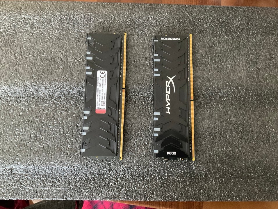 Yüksek performans için tasarlanmış iki siyah HyperX Predator DDR4 RAM modülü. Etkin soğutma için koyu renk ısı yayıcıya sahiptir. ⚡ Ürünler temiz sorunsuzdur 8*2 toplam 16 gb