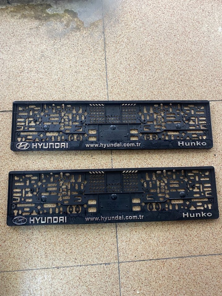 Hunko markalı, Hyundai logosu ve web sitesi yazılı siyah plaka çerçeveleri. Araç plakaları için tasarlanmıştır.