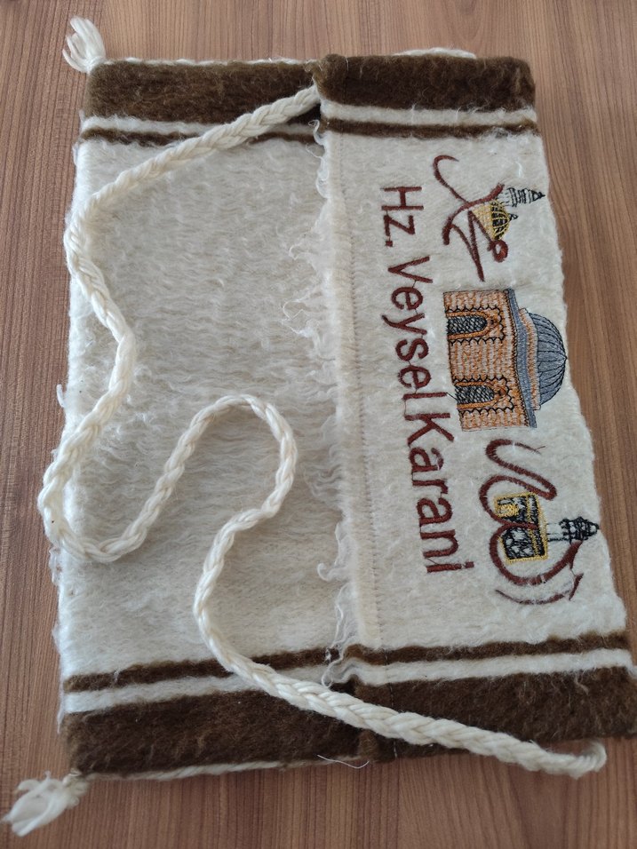 Yumuşak yün kumaştan, Hz. Veysel Karani işlemeli Kur'an kılıfı