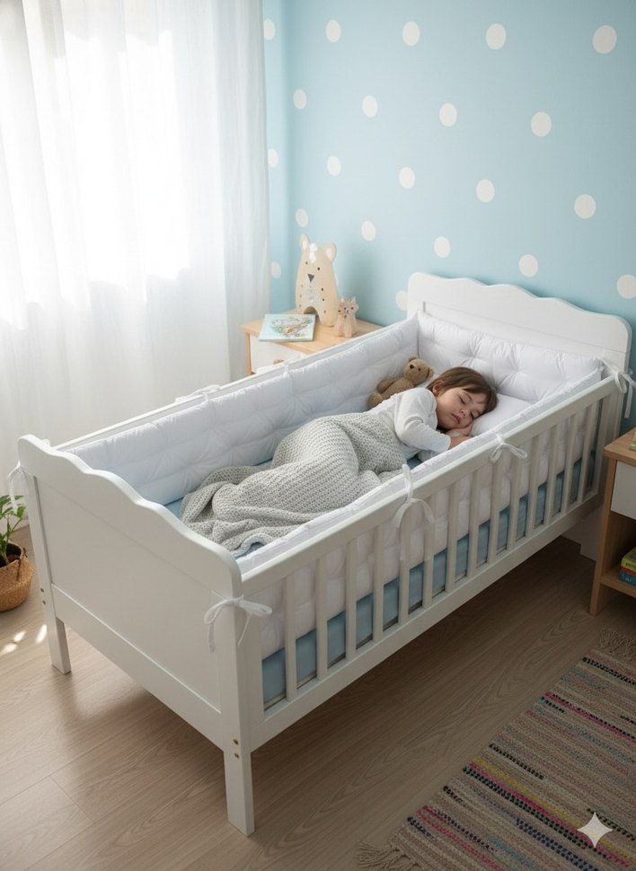bağcıklı, yumuşak sentetik kumaştan yapılmış beyaz bebek yatak koruyucuları, beşik kenarlarını korumak için tasarlanmıştır. ️