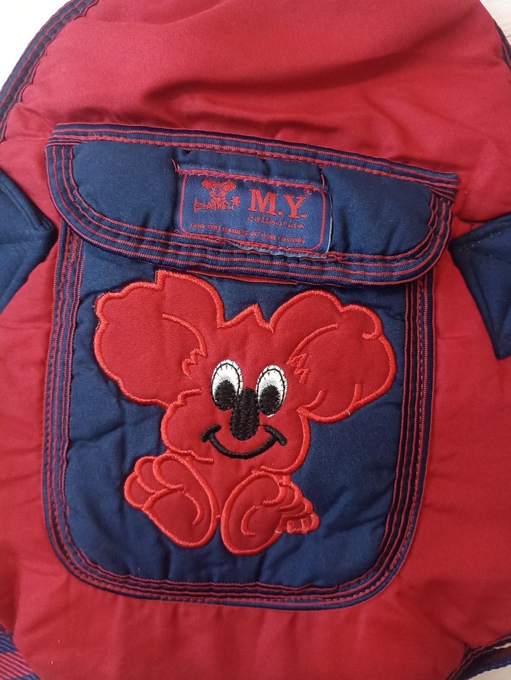 Renkli kırmızı bebek taşıyıcı, ön cepte M.Y logosu ve eğlenceli nakışlı figür içerir. Rahat ve kullanışlıdır.