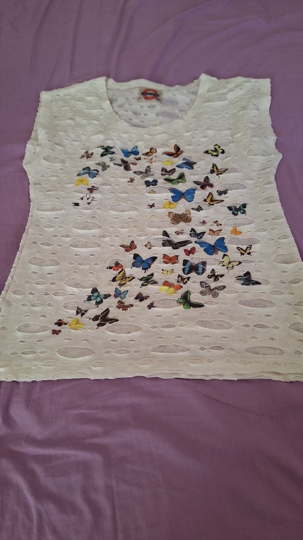erenkli kelebek baskılı, kısa kollu, beyaz renkli, bol kesim kadın tişört. Yuvarlak yaka ve kısa boy, bohem tarzını yansıtıyor.