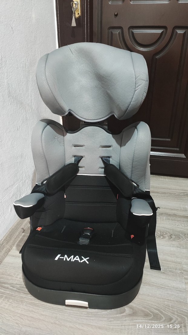 I-MAX çocuk oto koltuğu, ayarlanabilir başlık ve kolçaklara sahip gri ve siyah renklerde, konfor ve güvenlik sunar.