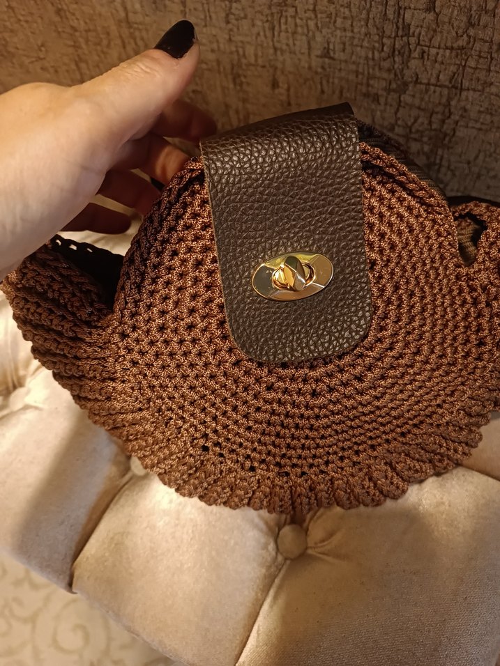 Kahverengi örgü , fmakrome ve nakış desenli bohem tarzda kadın çanta. Deri kapak ve altın renkli toka detayına sahiptir. içi astarlidir