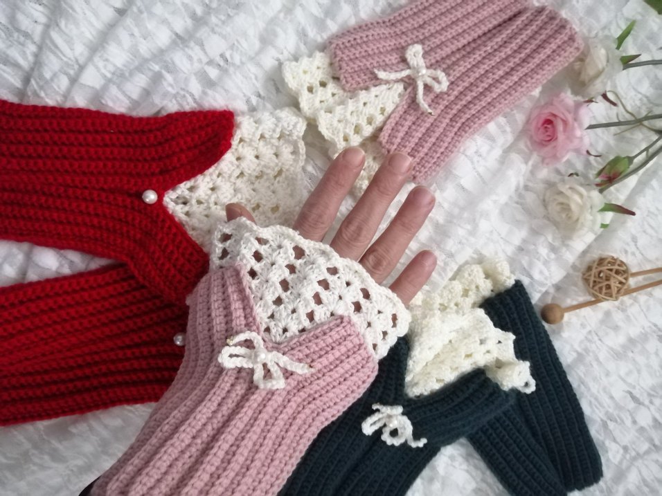 El emeğim yeni örüldü pudra pembesi Renkli örgü kadın eldivenleri, dantel detaylar ve küçük fiyonklarla bohem tarzda, sıcak ve şık bir görünüm sunar.