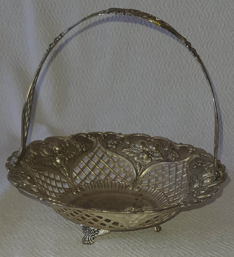 Parlak renkli, çiçek ve kafes desenli, kıvrımlı kulplu ve dekoratif ayaklı sepet.