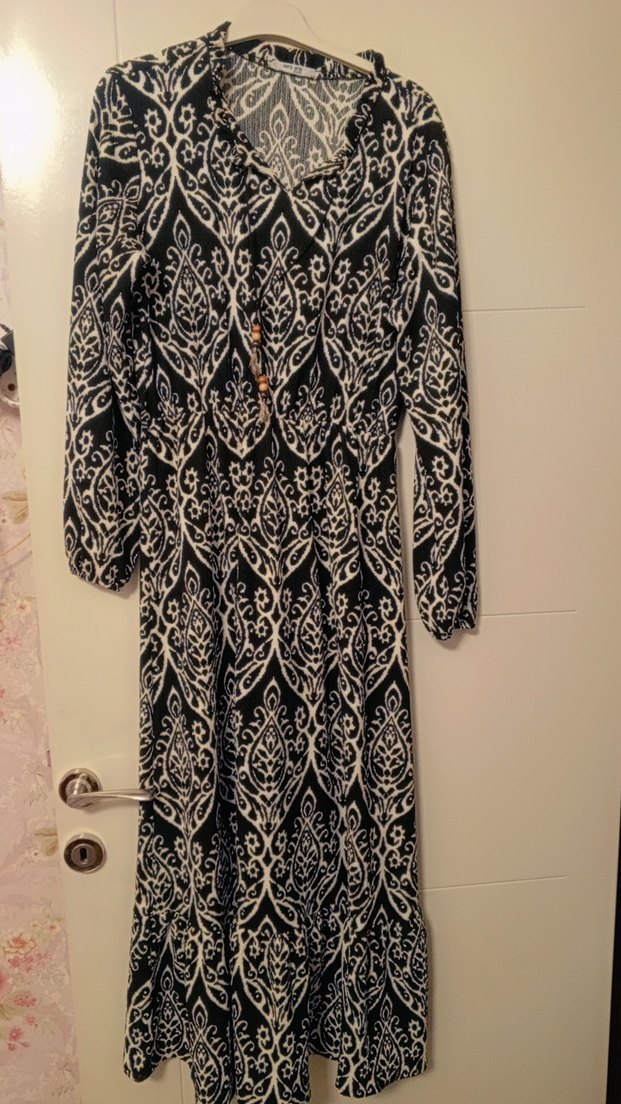 Siyah renkli, desenli ve bol kesim bohem uzun elbise. Uzun kollu, V yaka ve zincir detaylı, yumuşak sentetik kumaştan yapılmıştır. hiç sorunu yok yep yeni