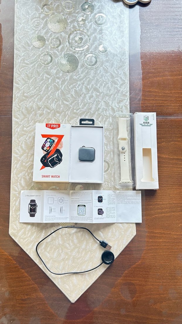 i7 Pro akıllı saat, beyaz kordonlu ve şarj cihazı ile kullanım kılavuzu içerir. Günlük kullanım için çeşitli akıllı özellikler sunar. ⌚