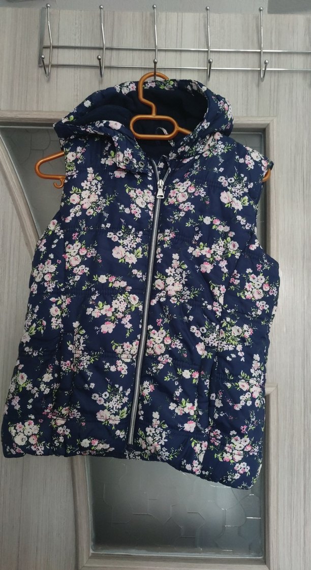 Koyu mavi çiçek desenli, kolsuz ve kapüşonlu kız çocuk yeleği. Fermuarlı ve kapüşonlu yaka yakaya sahip, rahat ve şık bir sokak stili ürünü.