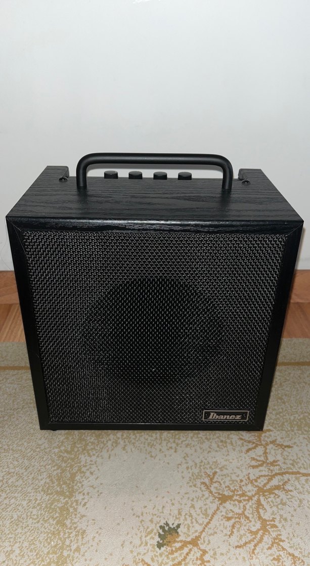 Taşınabilir kulplu, ön hoparlör ızgaralı siyah müzik sistemi.