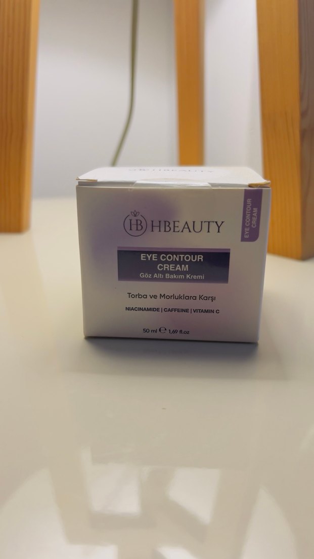 IBHBeauty Göz Altı Bakım Kremi, torba ve morluklara karşı niasinamid, kafein ve C vitamini içerir. 50 ml'lik bej kutuda sunulur.