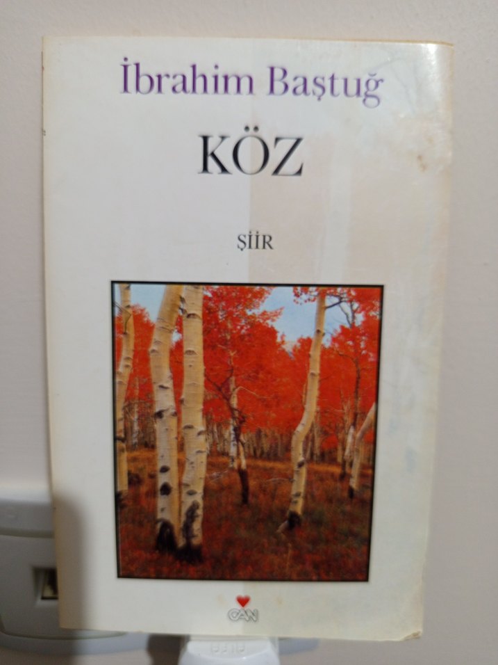 İbrahim Baştuğ'un 'Köz' adlı şiir kitabı, kızıl sonbahar yapraklarıyla kaplı huş ağaçları görseliyle sunuluyor. Şiir koleksiyonu içerir.