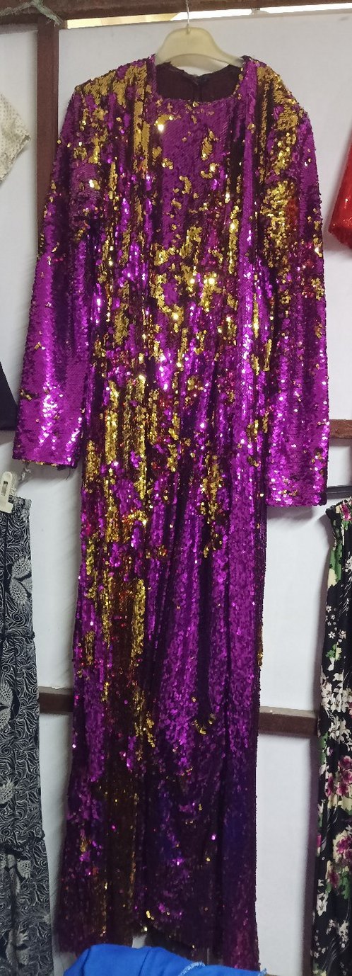 Parlak mor ve altın payetlerle süslenmiş uzun, bol kesim abiye elbise. Uzun kollu ve yaka detaylı, gösterişli partiler için ideal. ✨ ürün defosuz yeni