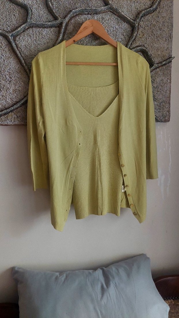 Triko twinset .Limon kufu renginde ,askili iç bluz ve hırka. Kumaşı viskondur. Italyadan alındı Fotoğraflarda görülen bir küçük sökük ve hırkalar ufak Bi leke var. S beden ama esnek olduğundan ince yapılı m bedene de uygun olabilir