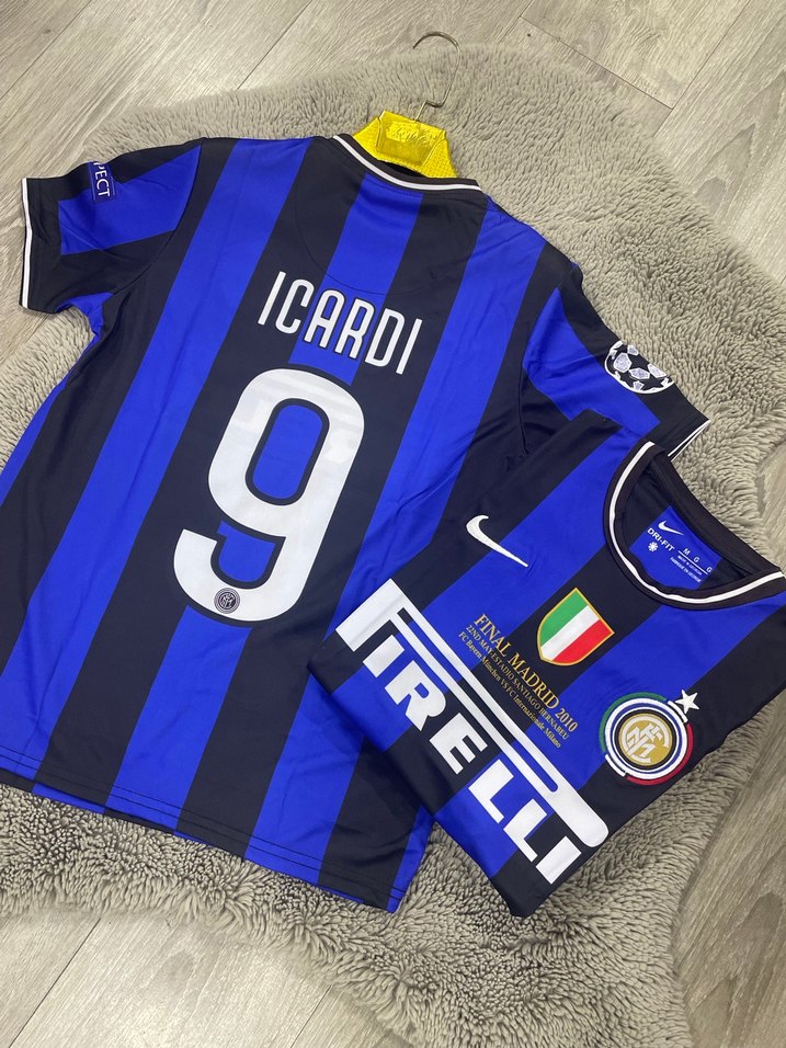 Lacivert kısa kollu erkek forması, baskılı çizgiler ve arka yüzde 'ICARDI 9' yazısı ile. Bisiklet yakalı ve cırt cırt detaylı, spor ve günlük kullanıma uygun. ⚽
