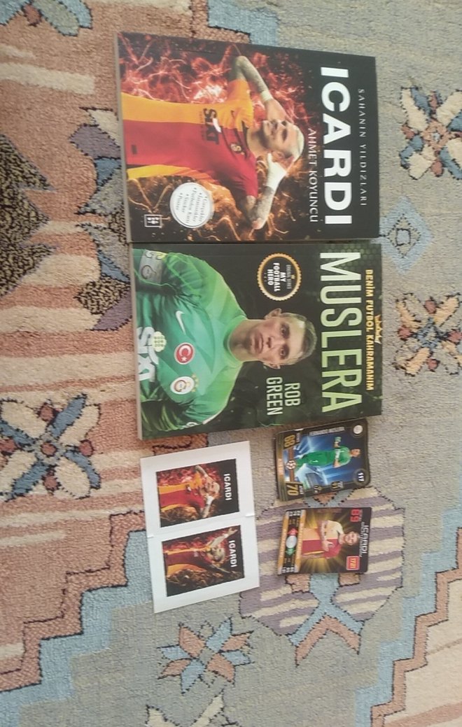 Futbolcular Icardi ve Muslera'nın yer aldığı iki spor kitabı ve ilgili kartlar. posterleri mevcut.