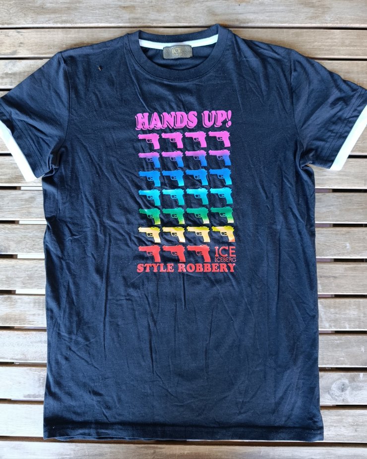 S beden , 92% pamuk 8% elastan penye kumaştan baskılı erkek t-shirt. Kol uçlarında beyaz elastik ribana detaylıdır. Sıfır orjinal ihraç ürünüdür, hiçbir defosu yoktur. Hijyen dolayısıyla iade alınmamaktadır, Bu yüzden lütfen sipariş verirken aşağıda belitilen ölçüleri dikkat ediniz. Omuzdan boy 64cm, göğüs 45 cm'dir.