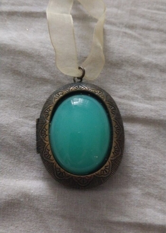 İçine resim koyabileceğiniz turkuaz renk, yedek askısıyla birlikte kolye.